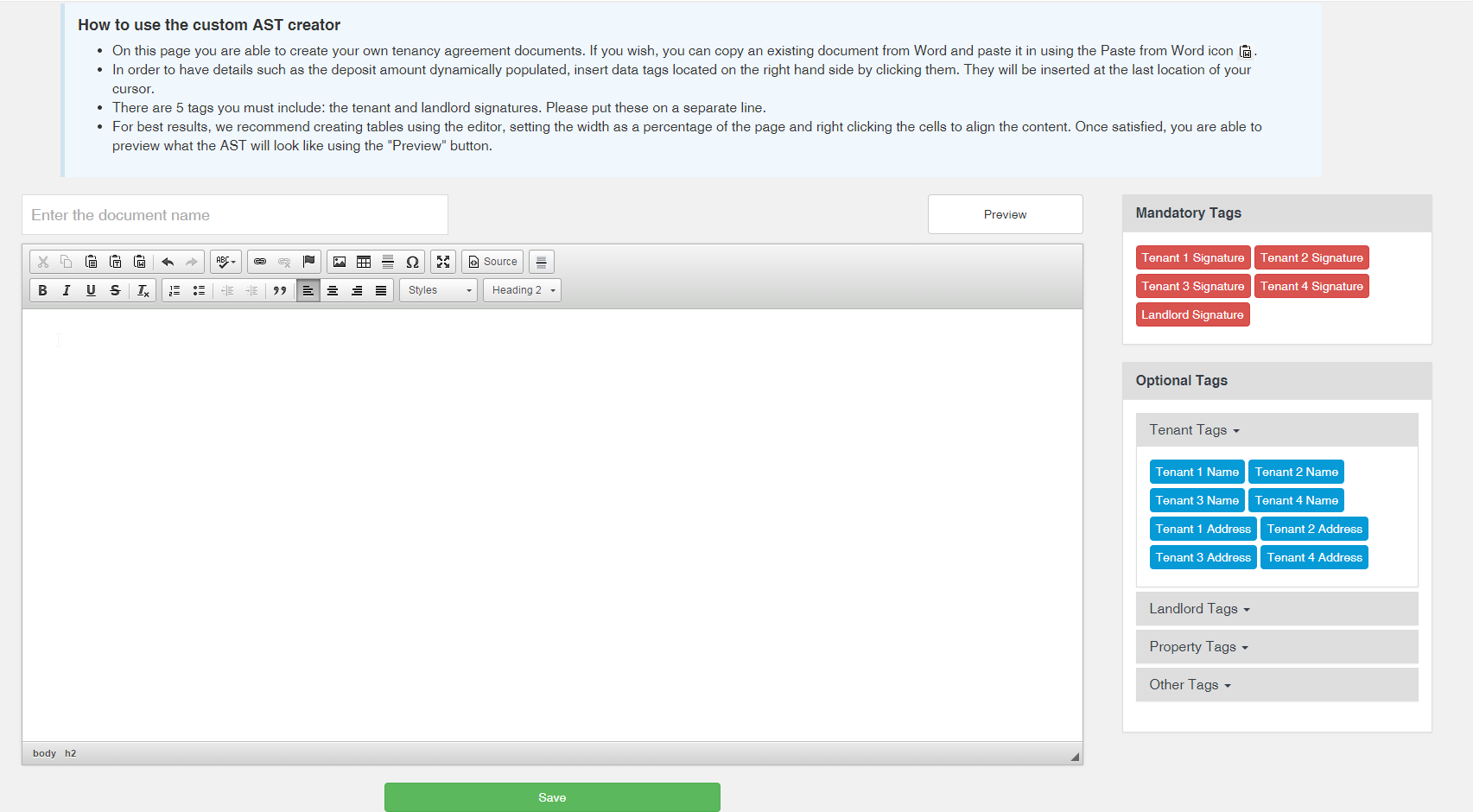 Throughout this section we’ll refer to ‘Tags’. Tags are used to identify pieces of information that will populate your completed documents; you can think of them as a placeholder. For example, if you enter a tag labelled ‘Landlord Name’, the system will fill in the chosen Landlord’s name during the application.