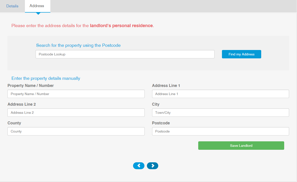 Enter the personal address for the Landlord either by typing in the details or by entering the post code and selecting the ‘Find my address’ button