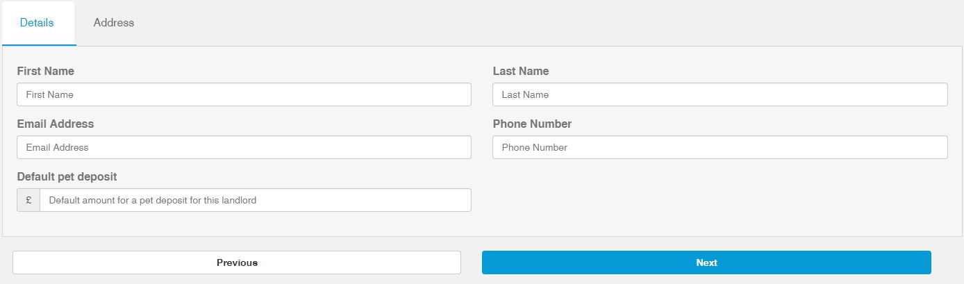 Enter the Landlord’s details including name, email address, phone number and the default pet deposit if the have one. Once completed use the "next" button to move to the address form.